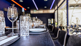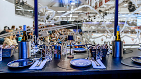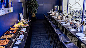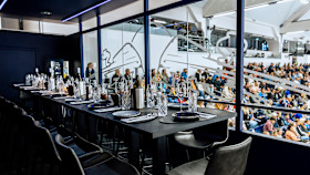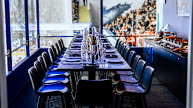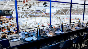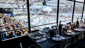 Im Mittelpunkt des Raumes steht ein elegant gedeckter Tisch, der zum Verweilen, Austauschen und Genießen einlädt. Hier entsteht der perfekte Rahmen für Kundengespräche, Teamevents oder besondere Anlässe im kleinen Kreis. Für das kulinarische Erlebnis sorgt unser Cateringteam mit abwechslungsreichen Speisen und einer erlesenen Auswahl an Getränken – vor dem Spiel und in den Drittelpausen.